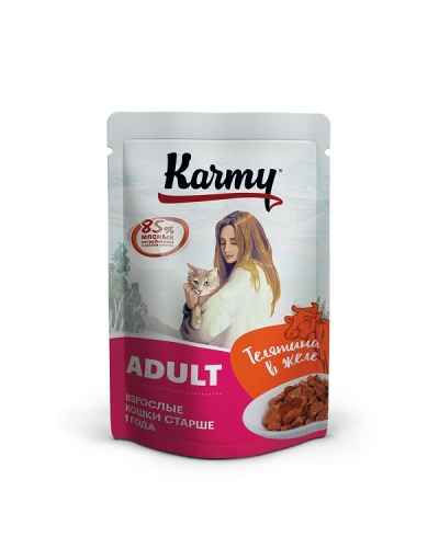 Karmy Adult - это порция аппетитных кусочков в ароматном желе, приготовленных с учетом индивидуальных потребностей взрослых кошек всех пород старше 1 года. В составе корма только натуральные ингредиенты, а также все необходимые микроэлементы и витамины для поддержания здоровья и полноценной жизни вашего любимца.