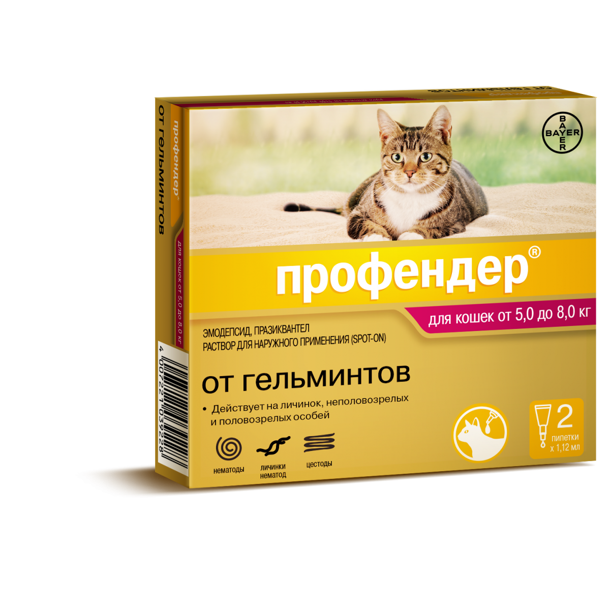 Профендер® – комбинированный антигельминтный лекарственный препарат. В 1мл препарата содержится эмодепсид - 21,43 мг и празиквантел - 85,75 мг. Профендер® выпускается в виде капель на холку в трех дозировках – для котят и кошек до 2,5кг, для кошек 2,5-5кг и для кошек 5-8кг. Производитель – компания Байер (Германия).