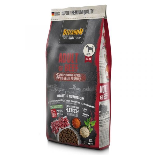 Прекрасное решение для собак с непереносимостью глютена и белка домашней птицы. В рецептуре зерно заменяется высококачественным амарантом, который содержит значительно более высокие уровни важных питательных веществ (белок, незаменимая аминокислота лизин, ненасыщенные жирные кислоты, минералы, микроэлементы). Большое содержание свежего мяса (40%) делает корм на говядине настоящим лакомством даже для привередливых собак. Содержание белка и жира адаптировано к потребностям зрелых собак всех пород с нормальным уровнем активности.
